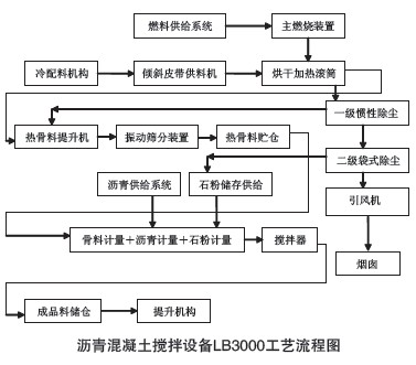 以一家瀝青混凝土攪拌設備LB3000袋式除塵器為例,其生產能力是每小時180~240噸,煙氣入口溫度小于200℃,成品料溫度140℃~180℃,因為燃料為重油,所以煙氣里含有一定的酸性氣體,而煙塵主要來自骨料烘干系統和重油燃燒的殘留物,粉塵顆粒細,并帶有粘性,而且骨料有時含水量比較大,烘干時會產生大量的水蒸汽。根據以上工況,除塵器濾料選用防油、防水NOMEX耐高溫針刺氈濾料。瀝青混凝土攪拌設備LB3000工藝流程如下圖,除塵器具體參數如表2。