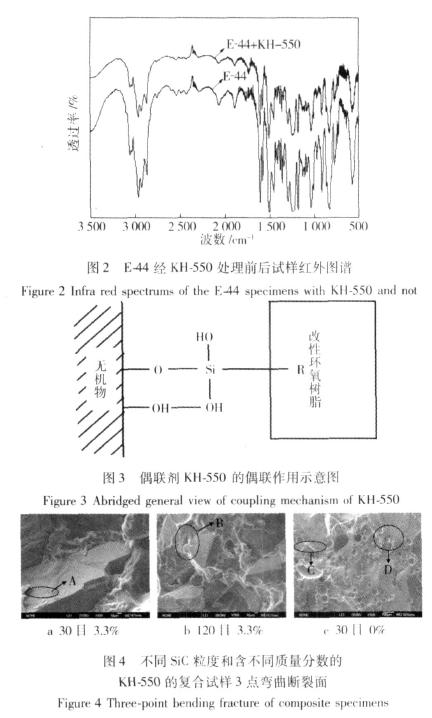如圖2所示,經KH-550處理后環氧樹脂E-44在2921、1629、1470、1390cm-1出現了甲基、亞甲基等與KH-550官能團對應的吸收峰。這些特征表明,偶聯劑分子已靠化學鍵合作用聯接到環氧樹脂表面。這樣,2個性質不同的化學反應把環氧樹脂與填料顆粒、金屬基體以化學鍵聯接起來,起著架橋作用,從而使它們在相互接觸的表面交界處結合得更加牢固,其偶聯作用示意圖如圖3所示。