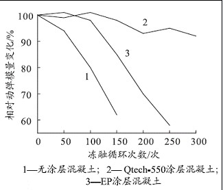 研究結果表明:環氧EP涂層混凝土在50次凍融循環開始出現裂縫,250次凍融循環后涂層完全剝落,相對動彈模量下降到60%以下,失去防護效果。聚脲Qtech-550涂層混凝土表現出很高的抗凍融性,經300次凍融循環后表面完好無損,相對動彈模量略有下降。