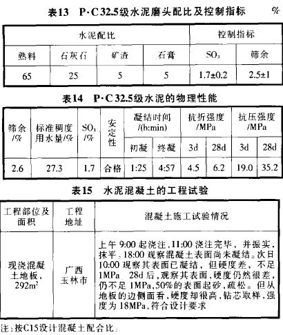 表3是2003年使用P•C 32.5級水泥出現的混凝土表面不凝結和硬度差的案例,混合材主要為黑色石灰石,該水泥經廠方和用戶雙方現場抽樣,仲裁檢驗均為合格品。其結果見表4。