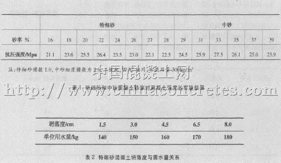 低砂率。在實踐中, 計算特細砂砂率時不考慮漿體的富余系數, 相反地采用比計算值小2%~3%砂率來配置, 以粉煤灰的超量來改善低砂率特細砂混凝土的合易性。
