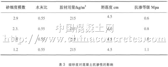 特細砂混凝土的抗滲性能。特細砂混凝土和易性好, 振搗時流動性好, 其抗滲性一般優于中粗砂混凝土。從表3 可以看出, 隨著砂細度模數的減少, 混凝土抗滲等級有所增加。