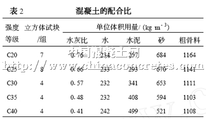 本試驗配置了C20、C25、C30、C35 及C40 五種強(qiáng)度的再生骨料混凝土,砂率均為0.37 ,采用蔣業(yè)浩[5 ] 建議的配合比進(jìn)行試配,根據(jù)JGJ55 - 2000《普通混凝土配合比設(shè)計規(guī)程》最終確定再生骨料混凝土的配合比。混凝土的最終配合比見表2。立方體試塊尺寸為150mm×150mm×150mm ,棱柱體試塊尺寸為150mm ×150mm ×300mm ,測定其彈性模量和軸心抗壓強(qiáng)度。