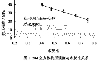 試驗測定了再生骨料混凝土立方體28d 抗壓強(qiáng)度。圖1為在砂率為0.37 情況下,再生骨料混凝土抗壓強(qiáng)度與水灰比的關(guān)系。從圖中可以看出,抗壓強(qiáng)度基本隨著水灰比的減小而不斷增大,較好地符合線性關(guān)系。再生骨料混凝土28d齡期抗壓強(qiáng)度( f cu ) 與水泥實際強(qiáng)度( f ce ) 及水灰比( WPC) 之間的關(guān)系可以寫成普通混凝土經(jīng)驗公式的形式: