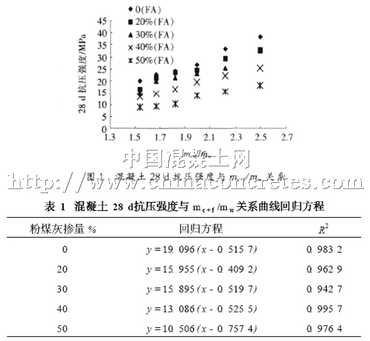 由于粉煤灰對混凝土強(qiáng)度的影響,Bolomy公式是否適用于粉煤灰預(yù)拌混凝土配合比設(shè)計(jì)還有待于進(jìn)一步研究. 本研究引用文獻(xiàn)[ 10 ]中的一組實(shí)驗(yàn)數(shù)據(jù)來說明Bolomy公式對粉煤灰預(yù)拌混凝土的適用性(見圖1). 從圖1可以看出,各摻量粉煤灰預(yù)拌混凝土其28 d抗壓強(qiáng)度與膠水比mc + f /mw 線性關(guān)系明顯,其回歸方程及相關(guān)性見表1.