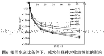 2.2 相同水灰比條件下,不同減水劑品種在相同摻量下對收縮性能的影響