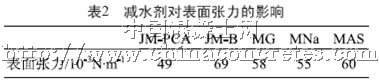 表2為按實驗配比中外加劑與水的比例配制的外加劑溶液的表面張力。按照毛細管張力理論的研究,溶液表面張力的降低使毛細孔張力下降,從而能夠降低干縮值。這與實驗結果較為吻合,隨表面張力的降低,漿體的干縮值降低。