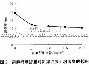 在試驗(yàn)過(guò)程中新拌劍麻纖維混凝土的泌水率下降,泌水時(shí)間大大推遲,當(dāng)劍麻纖維摻量大于3.0 kg/m3 時(shí),劍麻纖維混凝土幾乎不發(fā)生泌水現(xiàn)象。劍麻纖維摻量對(duì)新拌混凝土坍落度的影響見圖2。