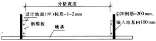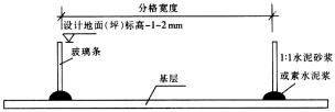 圖 1 地面模板支設(shè)方法 ( a)地面厚度50~100㎜;(b)地面厚度>100㎜ 當(dāng)?shù)孛婧穸葹?100mm以上時(shí),應(yīng)采用圖1(b)的支設(shè)方法。建筑工藝要求較高時(shí),分格條可采用20~ 30mm高、2~3mm厚鋼條,用 Φ 12螺桿、螺母進(jìn)行調(diào)節(jié),以保證耐磨地面的平整度和美觀效果。模板應(yīng)順直,其剛度和支撐應(yīng)符合規(guī)范規(guī)定。 ( 2)在混凝土基層上,當(dāng)厚度在50~100mm內(nèi)(含100mm)時(shí),宜采用粘玻璃條的方法代替鋼模板(圖2);當(dāng)厚度在100mm以上時(shí),宜參考1(b)的支設(shè)方法,或者參考圖2的方法,其中玻璃條改用銅條代替,用膨脹螺栓固定在混凝土基層上。