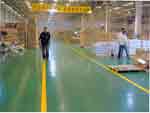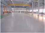 2、抹光面放樣 依建筑物結(jié)構(gòu)基準(zhǔn)墨線(如墻面+ 50㎝線),用水準(zhǔn)儀在地坪澆筑區(qū)域內(nèi)定出混凝土預(yù)定澆筑厚度,設(shè)置水平高程標(biāo)記,并認(rèn)真復(fù)核,控制最大凹凸偏差在3~5㎜以內(nèi)。 3、混凝土澆筑 ( 1)混凝土澆注前灑水使地基處于濕潤(rùn)狀態(tài)。為減少泌水,應(yīng)控制水灰比和坍落度,商品混凝土利用溜槽配合人工卸料,不宜采用泵送。 ( 2)混凝土盡可能一次澆筑至標(biāo)高,局部未達(dá)到標(biāo)高處利用混凝土料補(bǔ)齊并振搗,嚴(yán)禁使用砂漿修補(bǔ)。使用平板振搗器振搗,并用特制的鋼滾筒多次反復(fù)滾壓,柱、邊角等部位用木抹拍漿。混凝土刮平后水泥漿浮出表面至少3㎜厚。 ( 3)混凝土澆筑完畢,采用橡皮管或真空設(shè)備除泌水去,重復(fù)兩次以上后開(kāi)始耐磨材料施工。耐磨材料施工前,中期作業(yè)階段施工人員應(yīng)穿平底膠鞋進(jìn)入,后期作業(yè)階段應(yīng)穿防水紙質(zhì)鞋進(jìn)入。 二、撒布耐磨材料操作要點(diǎn) 1、攪拌: 耐磨地面硬化劑已經(jīng)均勻預(yù)混。 2、第一次撒布耐磨材料及抹平、鏝光 ( 1)耐磨材料撒布的時(shí)機(jī)隨氣候、溫度、混凝土配合比等因素而變化。撒布過(guò)早會(huì)使耐磨材料沉入混凝土中而失去效果;撒布太晚混凝土已凝固,會(huì)失去粘結(jié)力,使耐磨材料無(wú)法與其結(jié)合而造成剝離。判別耐磨材料撒布時(shí)間的方法是腳踩其上,約下沉5㎜時(shí),即可開(kāi)始第一次撒布施工。 ( 2)、墻、柱、門和模板等邊線處水分消失較快,宜優(yōu)先撒布施工,以防因失水而降低效果。 ( 3)第一次撒布量是全部用量的2/3,拌合物應(yīng)均勻落下,不能用力拋而致分離,撒布后即以木抹子抹平。耐磨材料吸收一定的水份后,再用鏝刀機(jī)碾磨分散并與基層混凝土漿結(jié)合在一起。 3、第二次撒布耐磨材料及抹平、鏝光 ( 1)第二次撒布時(shí),先用靠尺或平直刮桿衡量水平度,并調(diào)整第一次撒布不平處,第二次撒布方向應(yīng)與第一次垂直。 ( 2)第二次撒布量為全部用量的1/3,撒布后立即抹平,鏝光,并重復(fù)鏝光機(jī)作業(yè)至少兩次。鏝光機(jī)作業(yè)時(shí)應(yīng)縱橫向交錯(cuò)進(jìn)行,均勻有序,防止材料聚集。邊角處用木抹子處理。 ( 3)面層材料硬化至指壓稍有下陷時(shí),鏝光機(jī)的轉(zhuǎn)速及角度應(yīng)視硬化情況調(diào)整,鏝光機(jī)進(jìn)行時(shí)應(yīng)縱橫交錯(cuò)3次以上。 ( 4)耐磨地坪的平整度要求為2m見(jiàn)方最大偏差3~5㎜,同標(biāo)高極高點(diǎn)與極低點(diǎn)的最大偏差不大于20㎜。盡量避免龜裂、脫皮或起砂現(xiàn)象。 三、表面修飾及養(yǎng)護(hù) 1、鏝光機(jī)作業(yè)后面層仍存在抹紋較凌亂,為消除抹紋最后采用薄鋼抹子對(duì)面層進(jìn)行有序,同向的人工壓光,完成修飾工序。 2、耐磨地坪施工5~6h后噴灑養(yǎng)護(hù)劑養(yǎng)護(hù),用量為0.2升/㎡。或面覆塑料薄膜防止引起開(kāi)裂。 3、耐磨地坪面層施工完成24h后即可拆模,但應(yīng)注意不得損傷地坪邊緣。 4、完工3~5d后宜做切割縫,以防不規(guī)則龜裂,切割縫間宜為6~8m(一般根據(jù)車間柱距離確定)。切割應(yīng)統(tǒng)一彈線,以確保切割縫整齊順直,切割深度應(yīng)至少為地坪厚度的1/5(建議切割由土建完成),填縫材料采用預(yù)先成型或切割的彈性樹(shù)脂等材料,建議使用密封膠。 [應(yīng)用實(shí)例1] 金剛砂整體耐磨地坪施工技術(shù) 1、材料 金剛砂為金屬氧化物骨料或金屬骨料硬化劑。骨料物相組成主要為 Al 2 O 3 、 Fe 2 O 3 、 TiO 2 等金屬氧化物或金屬材料骨料。金屬氧化物骨料可以是天然或人工燒結(jié)產(chǎn)品。 金剛砂采用干撒式方法直接施工于初凝階段的混凝土表面,以獲得比非金屬骨料更優(yōu)越的耐磨和抗沖 擊性能。金剛砂與混凝土基面整體結(jié)合,不會(huì)脫落。 混凝土地面用水泥基耐磨材料(金剛砂加一定比例的硬化劑拌和而成 )的要求見(jiàn)下表中的Ⅱ型技術(shù)要求。混凝土采用預(yù)拌混凝土(強(qiáng)度等級(jí)C25以上),水泥用量≥300kg/m 3 ,粉煤灰摻量≤8%,耐磨材料用量4~8kg/m 2 (推薦使用5kg/m 2 )。 耐磨材料的技術(shù)指標(biāo)