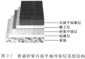 3 、普通砂漿自流平地坪 (1) 涂層系統(tǒng)結(jié)構(gòu) 涂層系統(tǒng)結(jié)構(gòu)見(jiàn)圖 2 — 7 (2) 涂層特點(diǎn) (3) 技術(shù)參數(shù)