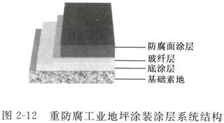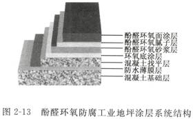 2 、酚醛環(huán)氧耐溫防腐工業(yè)地坪 ①技術(shù)方案 選用環(huán)氧酚醛涂料,充分考慮了強(qiáng)酸 ( 硫酸:、硝酸和磷酸 ) 和強(qiáng)堿 ( 氫氧化鈉 ) 交替侵蝕的特點(diǎn),設(shè)計(jì)為酚醛環(huán)氧涂料三布五油施工工藝 ( 見(jiàn)圖 2 — 13) 。