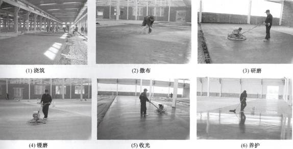 第一次撒料:將規(guī)定用量 2/3 的耐磨材料均勻撒布在剛初凝的混凝土表面。 第一次提漿:街耐磨材料吸收一定水分后,利用機(jī)械進(jìn)行提漿作業(yè),并用刮尺找平。 第二次撒料:待耐磨材料硬化情況至一定階段,再將規(guī)定量的 1/3 材料進(jìn)行第二次撒布作業(yè),并用機(jī)械提漿。 機(jī)械鏝刀收光:根據(jù)地坪的硬化情況,利用機(jī)械鏝刀收光作業(yè)。 養(yǎng)護(hù):地坪收光完畢,進(jìn)行薄膜養(yǎng)護(hù)或推薦專用養(yǎng)護(hù)劑養(yǎng)護(hù)。 應(yīng)用:根據(jù)天氣情況,在使用前推薦專業(yè)清潔打蠟,具有明顯裝飾效果。