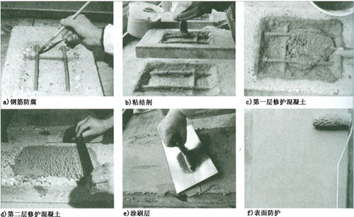 3 、施工注意事項 (1) 清理基面,鑿除破損、松動的混凝土,噴砂 ( 或用鋼刷 ) 除銹和油污,使外露鋼筋表面無銹蝕,且混凝土表面粗糙。 (2) 抹砂漿前 2 h ,用飲用水沖洗待修補部位,使混凝土表面處于飽和狀態(tài),但表面不能有明水。 (3) 人工修補時,無論采用機械噴涂還是人工抹砂漿,應(yīng)朝一個方向使用抹刀,并且盡量一次抹完,避免來回抹。如修補厚度超過 3 cm 時,應(yīng)分層抹,層與層之間應(yīng)間隔 3 ~ 4 h ,每層厚度不超過 2 cm 。 (4) 修補砂漿養(yǎng)護 48 h 后再涂混凝土防碳化劑。