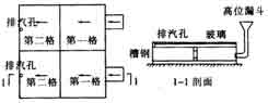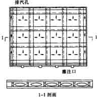 2 )模擬試驗: ① 用 10 號槽鋼制成 2m × 2m 的“田”字形方框,在“十”字槽鋼上開 200m m× 50mm 的橢圓孔,并在對應一側開 Φ 20 的排汽孔,將其放置在一平整的混凝土面上,根部用水泥砂漿封嚴,在上側覆蓋 1 塊普通玻璃,四周用密封膠帶與槽鋼封閉。 ② 采用高位灌漿方法進行灌漿,灌漿方法如右圖所示。③ 試驗發現,第一格基本灌滿,但第二格的灌漿料還未達到一半,即灌漿失敗。 ④ 通過此次試驗,提出兩點改進措施:第一,采用超細骨料 ;第二,將槽鋼上的孔洞沿長度方向再擴大些(經設計允許)。再次試驗,取得了圓滿成功。