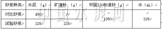 目前有氫氧化鈉激發強度法、消石灰激發強度法、礦渣水泥強度比值R法等。但這些方法都存在一定的不足和局限性。近年來,國際上和國內最常用的方法是:直接測定礦渣硅酸鹽水泥強度與硅酸鹽水泥強度的比值來評定磨細礦渣的活性。以摻加50%礦渣微粉的水泥膠砂強度與不摻礦渣微粉的硅酸鹽水泥砂漿的抗壓強度的百分比率來表示礦渣微粉的活性系數。活性系數越大,礦渣微粉活性越好。我國國家標準(GB/T18046-2000)規定:對比樣品的對比水泥為符合GB/T175的PⅠ型42.5級(原525號)硅酸鹽水泥;試驗樣品由對比水泥和礦渣粉按質量比1:1組成。試驗砂漿配比如表2所示: