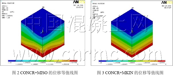 圖2 和圖3 分別是采用兩種本構(gòu)關(guān)系的Y 方向(受壓方向)的位移等值線圖,對(duì)比可以看出,采用CONCR+MISO 本構(gòu)關(guān)系更能形象的模擬試塊的真實(shí)受壓內(nèi)部變形情況,而采用CONCR+MKIN 本構(gòu)關(guān)系得出的內(nèi)部變形更加線性。而通過(guò)圖4 和圖5 的對(duì)比我們可知:雖然兩種本構(gòu)關(guān)系都能夠得到同試驗(yàn)數(shù)據(jù)比較吻合的曲線,但由于CONCR+MKIN 本構(gòu)關(guān)系最多可以設(shè)置6 個(gè)參數(shù),而CONCR+MISO 本構(gòu)關(guān)系可設(shè)置的參數(shù)更多,所以圖4 的應(yīng)力-應(yīng)變曲線更加接近試驗(yàn)值,各應(yīng)變點(diǎn)的應(yīng)力值更加準(zhǔn)確。