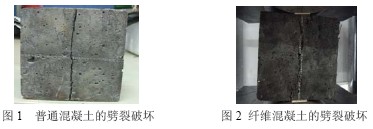 混凝土的抗拉能力只有抗壓能力的十分之一左右,在外荷載的作用下往往呈現脆性破壞,從混凝土劈裂試驗中可以很明顯的看出,普通混凝土試塊在達到其極限荷載時突然斷裂成兩半,是一種脆性破壞(圖1)。纖維的摻入,可以有效的提高混凝土的抗拉強度,當基體混凝土出現裂縫時,一部分荷載轉移到纖維上,從而提高了混凝土的抗拉能力。摻有纖維的混凝土試塊,其劈裂抗拉強度試驗的破壞過程呈現出很好的假延性,在達到極限抗拉強度值時并沒有突然斷裂成兩半,而是在中線附近延主裂縫延伸出去很多條微裂縫,但整個試塊始終被纖維約束在一起(圖2)。