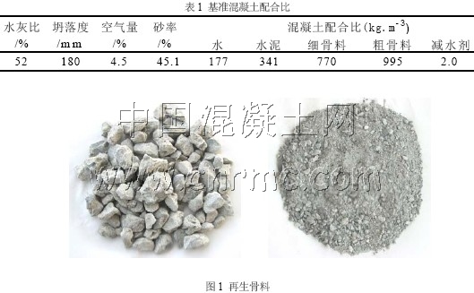 再生粗骨料與細骨料是在實驗室打澆普通C20 混凝土 (抗壓強度31.4 MPa) 為基準混凝土, 經1 個月在空氣中散水濕潤養護后, 用中小型撞擊式破碎機破碎, 再經5 mm 篩進行篩分后所得。5mm 以上的骨料經水沖洗曬干后當作再生粗骨料使用, 5mm 以下當做再生細骨料使用。表1 為基準混凝土的配合比, 圖1 為經破碎篩分后所得的再生骨料的照片。
