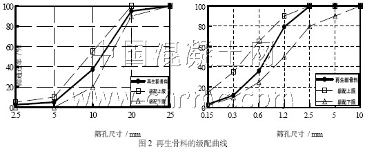 經篩分得出各個粒徑不同的再生粗骨料與細骨料之后, 再生粗骨料根據日本再生骨料暫定性能基準(案)所規定的再生骨料的顆粒級配以及有關規范進行調配, 圖2 為調配后的再生粗骨料與細骨料的級配曲線。