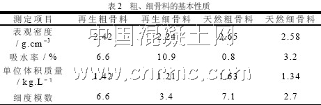 從調配好的再生粗骨料與細骨料中抽出試料,根據JIS 材料試驗有關規范測出其基本物理性質,及粗細骨料的表觀密度、吸水率、單位容積質量以及細度模數。 再生粗、細骨料以及天然骨料的基本材料性質如下表2。