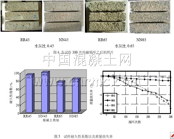(1) 因全再生混凝土與對比用的普通混凝土當中添加了高性能AE減水劑,不但減少了水的用量,而且適當的引氣,并連接混凝土中相對獨立的微小氣泡,當混凝土招受凍結時,能有效地緩解由自由水凍結而引起的較大的膨脹壓力,進而提高了混凝土的抗凍融循環的能力。