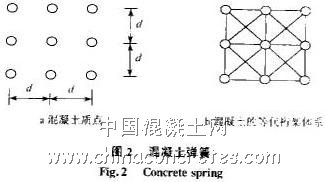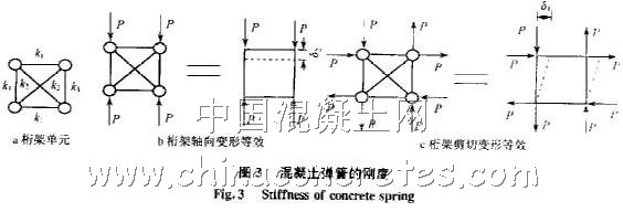 混凝土連結彈簧的初始剛度kc可按下述方法近似確定:對圖2a所示混凝土質點,由于假定混凝土質點之間用混凝土彈簧連結,整個混凝土體系就被等代為一個桁架體系,如圖2b所示。設豎向、水平彈簧初始剛度為kl(如果豎向、水平彈簧在混凝土內部,則初始剛度為2k1),斜向彈簧初始剛度為k2