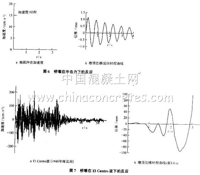首先,對結構輸入一個如圖6a所示的地面加速度記錄(加速度為15cm•s—2,持續(xù)時間為0.06s)、其目的在于激勵結構發(fā)生自振,以計算其自振特性.結構頂部的位移時程曲線如圖6b所示.從圖6b可以看出,橋墩的自振周期為0.7s,與結構動力學方法計算的結果0.68s十分接近.