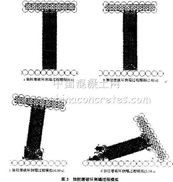 再對結構輸入EL Centro波〔1940年南北向,持續(xù)時間為53.47s〕,波形如圖7a所示,地面加速度峰值o.45g,前3.0s的墩頂位移時程曲線如圖7b所示〔由于開始倒場后的位移太大,3.0s以后未給出〕、橋墩破壞倒塌過程如圖5所示.從圖5可看出,在2.40s時,在橋墩底部水平彎曲裂縫已經發(fā)展為明顯的彎斜裂縫,形成局部破壞;在4.00s時,在橋墩底部塑性鉸區(qū),由于損傷積累,已經發(fā)生了剪切破壞,上部結構以橋墩底部為中心發(fā)生轉動;在5.54s時,徹底倒塌落地。