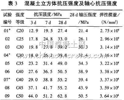 采用表2配合比制作的標準養護試件混凝土立方體抗壓強度、軸心抗壓強度及彈性模量試驗結果見表3。