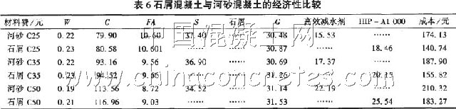 石屑混凝土除了應該具有環保方面的積極意義外,還希望它可以降低混凝土經濟成本。下面采用上述三個有代表性的河砂配合比與石屑混凝土經濟成本作一比較。比較用材料價格為水泥340元/t、粉煤灰105元/t、淡水河砂45元/t、石屑(不需費用)、碎石30元/t,HIP一A1000為1650元/t、純蔡系高效減水劑1 400元/t,水1.2元/t,比較結果見表6。