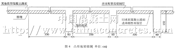 CRCP 加鋪層不設(shè)脹縮縫, 路面受溫度變化影響會產(chǎn)生較大的變形, 尤其是在路面端部, 年溫度變化條件下的端部自由位移有可能超過10cm, 從而對CRCP 端部附近的其他構(gòu)造物或路面結(jié)構(gòu)形成推擠。因此, 在橋頭或CRCP 加鋪層與其它類型路面相接處, 要采取設(shè)錨固端等結(jié)構(gòu)措施以限制其變形。目前CRCP 端部結(jié)構(gòu)主要采用凸形錨固地梁,構(gòu)造如圖4 所示。凸形錨固地梁數(shù)目一般3~5 個。錨固設(shè)施一般無法完全限制CRCP 的端部變形, 所以在與CRCP 連接的路面一定范圍內(nèi), 還需設(shè)置幾條脹縫以消除殘余變形。