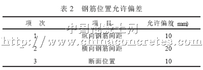 鋼筋的制作與安裝工序須檢測以下項目: 鋼筋接頭焊接點抗拉強(qiáng)度; 焊接質(zhì)量( 漏洞、不密實和焊接長度不足等) ; 同一截面的縱筋焊接面積; 鋼筋的縱橫向間距、高度和綁扎情況。鋼筋位置的偏差滿足表2 規(guī)定。