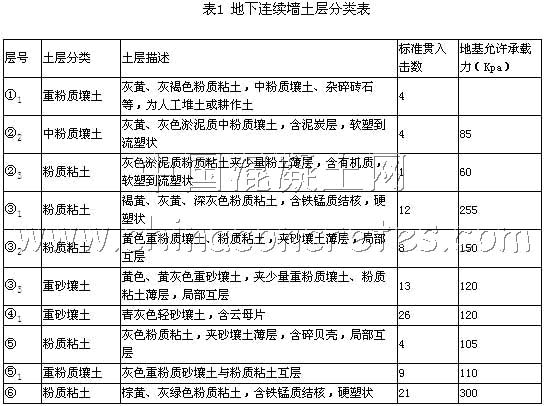 工程地質條件:根據江蘇省工程勘測設計院提供的《太浦河泵站工程地質水文地質勘察報告》中I-I/工程地質剖面圖所示,地連墻施工區內主要地層見表1:
