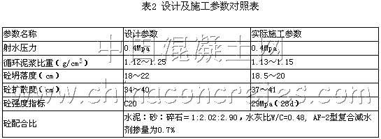 先前機械設備采用第二代射水造墻機,由于土層的粘粒含量高,就是更換三代機機后依然需6~8h才穿過該層,出現了擴孔、塌孔等較多質量問題。在施工過程中,針對該地質條件,在成孔器的底部兩側加焊鐵抓,勾切土體;側向開孔口,使進入成孔器的土體及時從開孔中排出,利用反循環泵抽出;還采取了超前預鉆孔破壞地層、采用高壓柱塞泵設備(加工配套管路)射水先行破壞硬塑狀地層等多種方法進行了摸索試驗,得出了有益的施工經驗——改進施工機具,特別是對成型器進行的多次大膽改造,以及根據進尺快慢及時調整施工參數,最終取得了提高工效、降低成本并保證施工質量。同時,對在軟塑到流塑狀地層中如何保證擴孔率也摸索出了有效經驗。