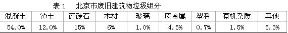 隨著建筑物種類和建筑材料的不斷發(fā)展,建筑垃圾的組成也發(fā)生了改變,北京市建筑裝潢垃圾的比例就由2001年的5%,提高到2005年的8%。從側(cè)面也說(shuō)明新開(kāi)工商品房及住宅建筑量有了較大增長(zhǎng)。2005年北京市建筑垃圾中,產(chǎn)生廢舊建材垃圾2700萬(wàn)噸,開(kāi)挖工程泥漿600萬(wàn)噸,建筑裝潢垃圾300萬(wàn)噸。分別占垃圾總量的75%、17%和8%。表1為廢舊建筑物垃圾各組分含量。