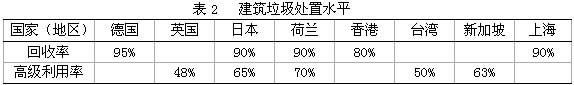 北京市建筑垃圾回收利用率還沒(méi)有具體準(zhǔn)確的數(shù)據(jù),但據(jù)相關(guān)部門推算,把土地開(kāi)挖回填、廢舊高附加值垃圾(如鋼筋、鐵絲、電纜等)有專人回收加以利用、施工垃圾回填等計(jì)算在內(nèi),其回收利用率應(yīng)該不會(huì)超過(guò)40%,按這一數(shù)據(jù),同比國(guó)外發(fā)達(dá)國(guó)家[4、5]和港、臺(tái)地區(qū),以及上海市,我們的努力還遠(yuǎn)遠(yuǎn)不夠,要做的還很多。世界各國(guó)(地區(qū))建筑垃圾處置水平見(jiàn)表2: