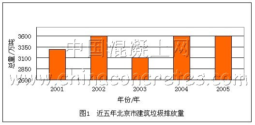 據(jù)統(tǒng)計(jì),2005年北京市建筑垃圾排放量達(dá)3600萬(wàn)噸,平均每日排放10萬(wàn)噸。按北京市常住人口1800萬(wàn)人口計(jì)算,人均排放建筑垃圾約2噸/年,遠(yuǎn)遠(yuǎn)超出我國(guó)人均排放建筑垃圾0.5噸/年的平均水平,是發(fā)達(dá)國(guó)家人均排放約0.3噸/年的7倍。截至2005年,我國(guó)建筑垃圾年排放量為4億噸,是世界建筑垃圾排放最多的國(guó)家,北京又以占全國(guó)建筑垃圾9%的份量位居第一,而且近年來(lái)北京市建筑垃圾年均排放量一直維持在這種高水平。近五年排放量見(jiàn)圖1。