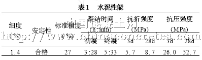 水泥:采用公開招投標方式采購,招標書中明確規定C3 A 含量不大于8 % ,堿含量0. 4 %~0. 6 %。通過對比,武漢亞東水泥有限公司生產的P ·O42. 5 水泥中標,水泥部分性能見表1 。