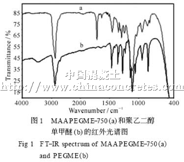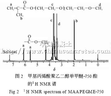 所得MAAPEGME-750 的紅外光譜用美國DIGILAB 公司生產的FTS3000 型傅立葉變換紅外光譜儀以KBr 涂膜法測定; 核磁共振用美國VARIAN 公司Mercury-400BB 型核磁共振儀進行測定, CDCl3 為溶劑, TMS 作內標.