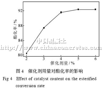 催化劑的加入不僅使酯化反應速度加快, 而且適當增加催化劑的用量可以提高酯化率. 由圖4 可見, 當催化劑的加入量達到聚乙二醇單甲醚質量的5 %時化率達到了92.35 % , 而當繼續增加催化劑的用量時酯化率不在變化, 故確定催化劑用量為聚乙二醇單甲醚質量的5 %為最佳.