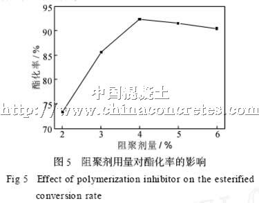 從圖5 可看出, 隨著阻聚劑加入量的增加, 酯化率先升高, 當其用量達到甲基丙烯酸質量的4 %時酯化率達到最大值, 而后若其用量繼續增加, 酯化率反而降低. 其原因可能是甲基丙烯酸為不飽和酸, 在反應過程中其單體之間及單體與甲基丙烯酸聚乙二醇單甲醚酯之間易發生聚合, 阻聚劑的加入有效阻止了聚合, 保證了體系酯化反應的順利進行, 但當其量超過丙烯酸質量的4 % , 有可能引發副反應而導致酯化率降低. 因此確定阻聚劑的最佳加入量應為甲基丙烯酸質量的4 %.