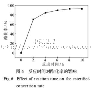 一般來說, 反應時間與酯化率成正比, 即延長反應時間有利于提高酯化率. 但是, 當酯化反應進行到一定程度, 體系達到平衡狀態以后, 酯化率不再隨時間的延長而增加, 所以, 反應時間也存在一個最佳值. 本實驗在酸醇摩爾比為1.8 , 催化劑用量為聚乙二醇單甲醚質量的5 % , 阻聚劑用量為甲基丙烯酸質量的4 % , 攜水劑量為聚乙二醇單甲醚質量的120 %條件下, 反應時間與酯化率的關系如圖6 所示. 由圖6 可看出, 酯化率隨時間的延長而不斷提高, 但當時間達到8 h , 酯化率已達90 %以上, 并且隨時間延長基本不再提高, 因而酯化反應時間確定為8 h.