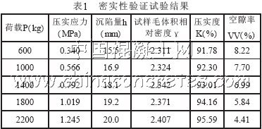 根據測定的靜力熱壓試樣的相對密度值, 將理論最大相對密度作為試驗用瀝青混合料的標準密度。對于密實性驗證試驗測定的沉陷量h及壓實度K和空隙率VV的計算結果, 如表1所示。