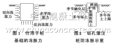 樁基在使用過程中由于凍土季節(jié)的變化將產(chǎn)生凍脹力。根據(jù)凍脹力作用于基礎(chǔ)表面的部位和方向,可劃分為3種:切向凍脹力、水平凍脹力和法向凍脹力(見圖 1)。水平凍脹力相互抵消,對(duì)工程造成破壞的主要是凍脹產(chǎn)生的切向力和法向力。在工程建設(shè)中,采取以下措施可以防止樁基礎(chǔ)凍脹:①為避免樁基礎(chǔ)受到法向凍脹力,將樁基礎(chǔ)嵌入多年凍土天然上限以下一定深度;②將鋼制擴(kuò)筒埋入多年凍土上限以下至少0.5m,護(hù)筒內(nèi)徑比樁徑大10cm,并于護(hù)筒外圍涂渣油,成樁后不拆除護(hù)筒,減少外表面的親水程度;③盡量采用高樁承臺(tái),凍脹嚴(yán)重地區(qū)采用鉆孔擴(kuò)底樁;④在護(hù)筒外側(cè)、低樁承臺(tái)底部采用渣油拌制粗顆粒土回填。以上措施能有效地減小切向凍脹力,降低凍土對(duì)護(hù)筒的上拔凍脹力(見圖2);⑤鉆孔采用旋挖鉆機(jī)干法成孔保證孔位置正確和鉆孔的垂直度;⑥采用低溫早強(qiáng)耐久混凝土,避免了混凝土低溫澆筑帶來的強(qiáng)度增長慢的問題。