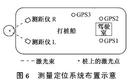 安裝在打樁船上的3個(gè)GPS接收機(jī)接收建立在陸地的基準(zhǔn)站及海中參考站發(fā)射的固定頻率數(shù)據(jù)鏈,以此作為定位的基準(zhǔn)數(shù)據(jù)。其工作原理:定位時(shí),由固定在打樁船上的GPS流動(dòng)站以RTK方式控制船體的位置、方向和姿態(tài),同時(shí)配合2臺(tái)固定在船上的免棱鏡測(cè)距儀測(cè)定樁身在一定標(biāo)高上的相對(duì)于船體樁架的位置,由此可推算出樁身在設(shè)計(jì)標(biāo)高上的實(shí)際位置,并顯示在系統(tǒng)計(jì)算機(jī)屏幕上。通過與設(shè)計(jì)坐標(biāo)比較,進(jìn)行移船糾位,直至偏位滿足要求。樁身的傾斜坡度由樁架控制。樁頂標(biāo)高根據(jù)由免棱鏡測(cè)距儀發(fā)出的紅色水平光束所指涂畫在樁身上的刻度,通過系統(tǒng)計(jì)算得出。具體定位前,將所要定位樁的設(shè)計(jì)中心坐標(biāo)、高程、平面扭角等參數(shù)輸入計(jì)算機(jī)內(nèi),定位時(shí),可在顯示屏上顯示實(shí)時(shí)樁位數(shù)據(jù)與圖形,同時(shí)也顯示設(shè)計(jì)沉樁位置和偏差,打樁船指揮人員根據(jù)顯示的有關(guān)信息指揮打樁船正確就位。