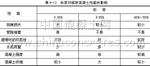 噴射混凝土的膠骨比,水泥與骨料之比通常取 1 ∶ 4 ~ 1 ∶ 4.5 ,水泥過少,回彈量大,初期強(qiáng)度增長慢;水泥過多,不僅產(chǎn)生的粉塵增多,而且混凝土的硬化收縮增大,無論在經(jīng)濟(jì)上或技術(shù)上都是不可取的。噴射工藝特點(diǎn)要求混凝土具有較好的粘附性。水泥含量的較佳值應(yīng)該是保證噴射混凝土具有較高粘附性的同時(shí),避免水泥過多造成浪費(fèi),增加成本。噴射混凝土水泥較佳含量為 300 ~ 350kg/m 3 。當(dāng)水泥用量超過 400kg /m 3 時(shí),混凝土的強(qiáng)度并不隨水泥用量增大而提高,有時(shí)反而會降低。水泥用量對噴射混凝土抗壓強(qiáng)度的影響關(guān)系如表 9-12 所示。