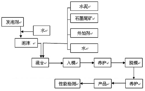 由于石墨尾礦顆粒細小,因此易于分散,將水泥、尾礦、減水劑、水按一定配比,在小型臥式攪拌機中均勻攪拌成泥漿;在此同時將發泡劑與水混合,在自制的高壓發泡機的高速攪拌下形成直徑約100微米的均勻細小泡沫;然后將發好的泡沫和攪拌好的漿體混合再快速攪拌,完成泡沫混凝土泥漿的均勻混合;將混勻的泡沫泥漿,放人模具中進行成型、養護。