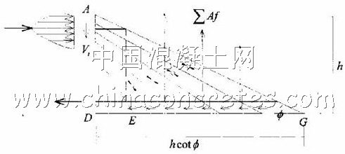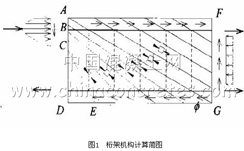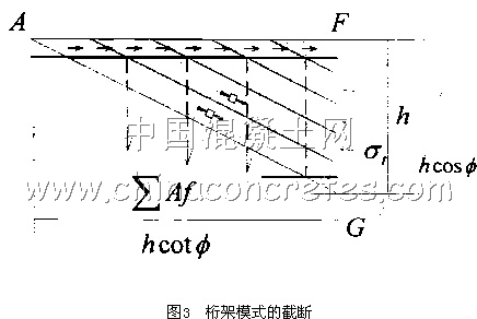 桁架機(jī)構(gòu)的計(jì)算簡(jiǎn)圖如圖1所示。AGF區(qū)為斜裂縫帶,存在有一定角度功的斜壓應(yīng)力場(chǎng)。由于外包碳纖維布的存在,對(duì)混凝土有約束的作用,所以在斜裂縫區(qū)域,桁架模型中混凝土壓桿實(shí)際受壓的有效面積增大,近似認(rèn)為全截面受壓。