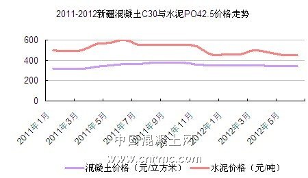 從圖中可以看到,新疆水泥價格波動幅度大,整體處于下降趨勢,主要原因還是來源于整體市場低迷,2012年上半年價格主要維持在460元/噸左右。不過由于今年新疆加大鐵路建設(shè),對水泥需求旺盛,同時,從近期的消息來看,各企業(yè)都表示新疆地區(qū)水泥出貨價格基本穩(wěn)定,因此后期水泥市場仍可以期待。與水泥價格相比,新疆混凝土價格就相對穩(wěn)定得多,并且2012年上半年的混凝土價格相比于2011年同期有所上升,但是從2012年上半年價格走勢來看,新疆混凝土市場也逐漸開始冷清起來。雖然新疆區(qū)域擁有諸多大型建筑工程項目,但受前期國家宏觀調(diào)控和貨幣緊縮的政策影響,項目啟動慢,開工率低,對混凝土的需求不大。再加上國家對房地產(chǎn)的嚴(yán)格調(diào)控,房地產(chǎn)行業(yè)低迷,同時水泥市場的不景氣,對混凝土市場又是一大打擊。